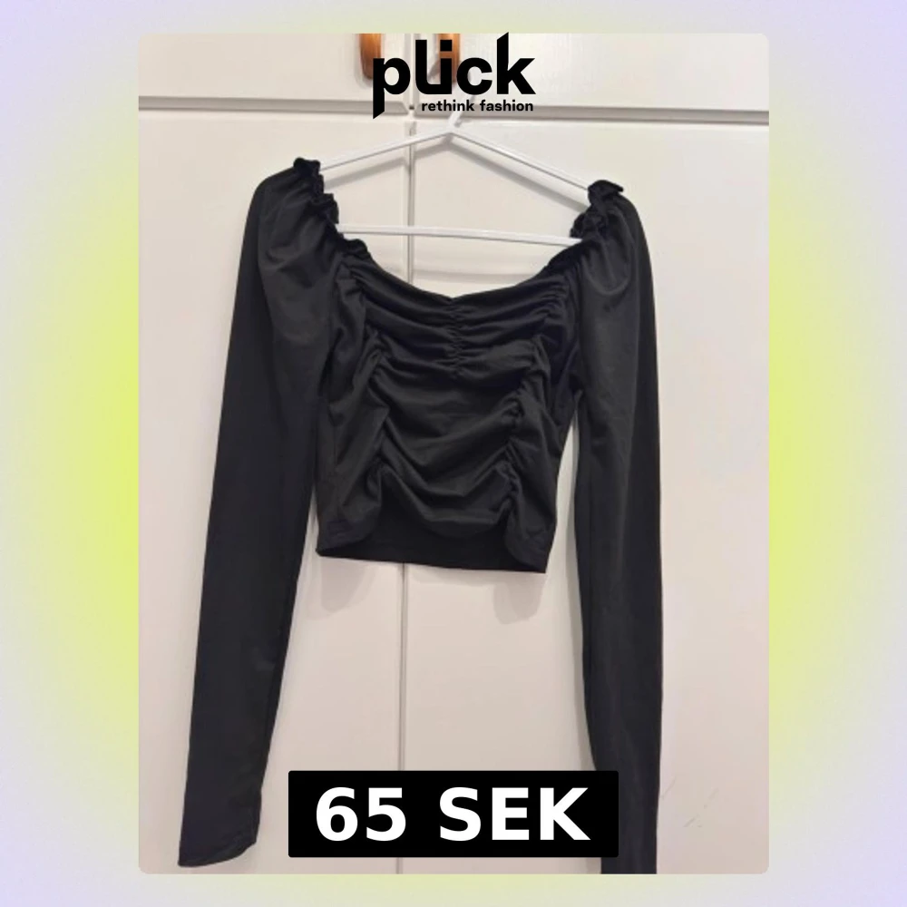 Trendig svart croppad topp med långa ärmar och snygga rynkdetaljer framtill. Toppen har en offshoulder-design och är tillverkad i mjukt material som sitter bekvämt mot kroppen. Perfekt för dig som vill ha en stilren men ändå unik look.