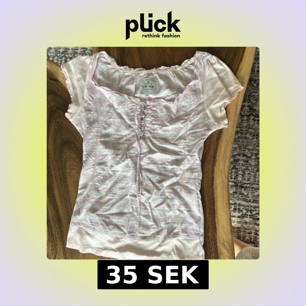 Supersöt rutig blus från ZE-ZE i ljusrosa och vit med diskreta blå linjer. Blusen har korta puffärmar, snörning framtill och en söt volangkant vid halsen. Materialet känns lätt och luftigt, perfekt för varmare dagar. Passformen är normal och toppen har en feminin vibe.