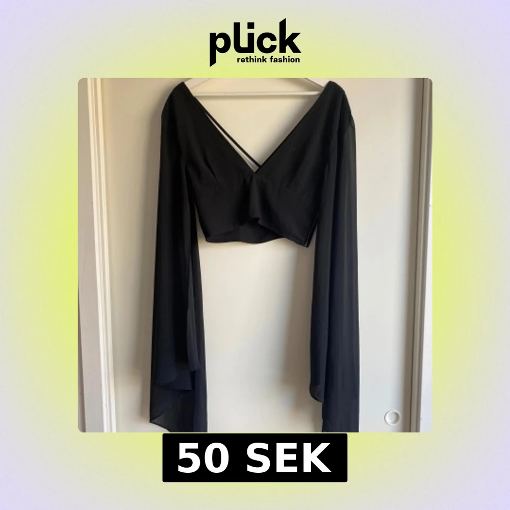 Säljer en svart croppad omlottopp med långa, vida ärmar och djup v-ringning både fram och bak. Toppen har tunna korsade band i ryggen som ger en snygg detalj. Perfekt för dig som gillar en edgy och trendig stil. Har använts på många festivaler och slår aldrig fel! Har fått en liten defekt som syns på bild, men annars i fint skick!