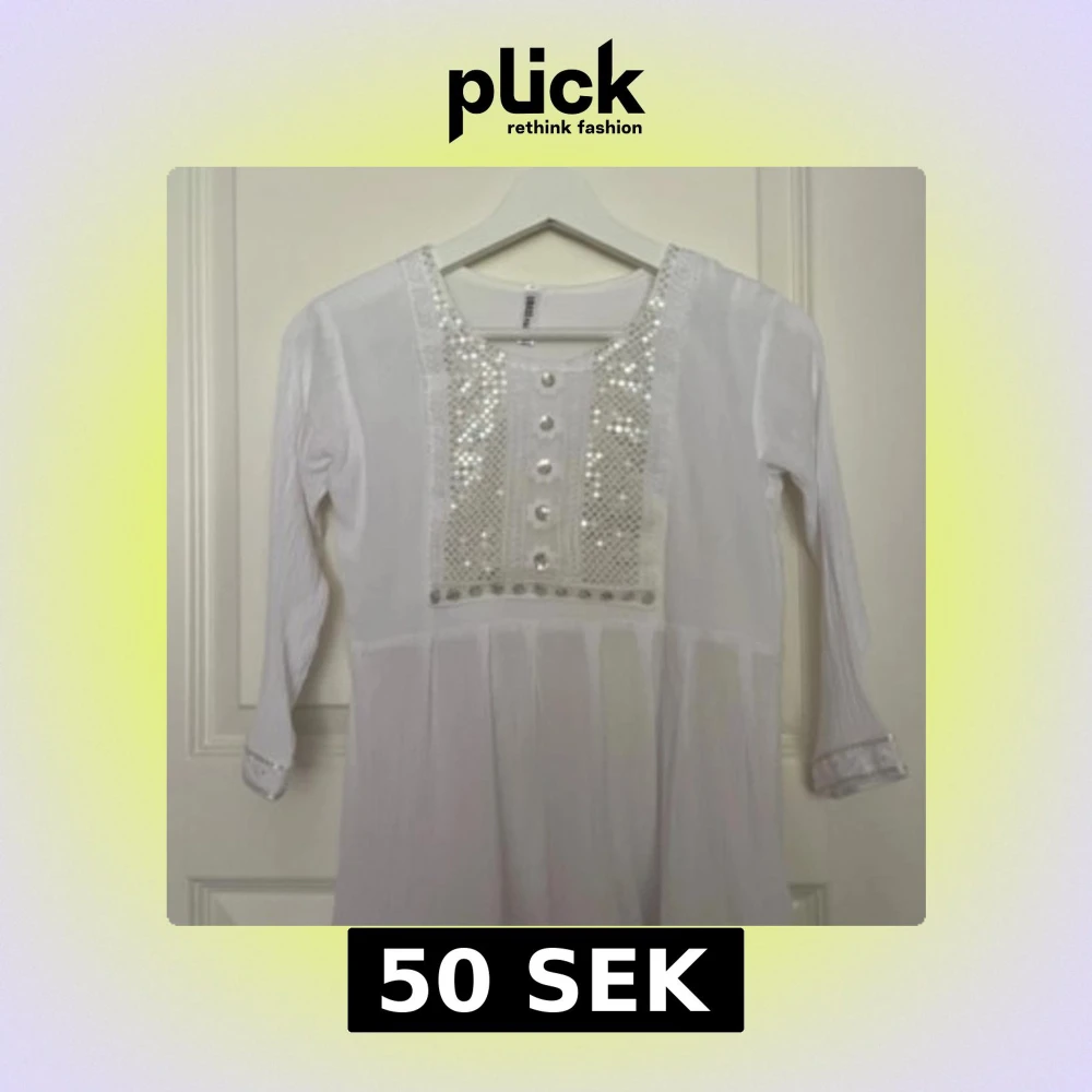 Supersöt vit top med glittriga paljetter och blommiga knappar framtill. har långärmade ärmar med dekorativ kant och ett flowigt fall. Perfekt för dig som gillar detaljer och vill sticka ut med lite extra shine.