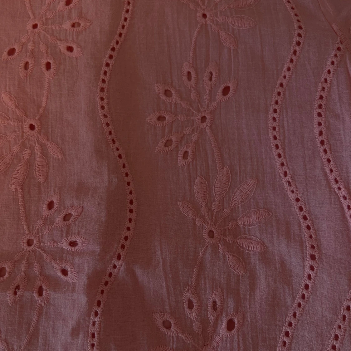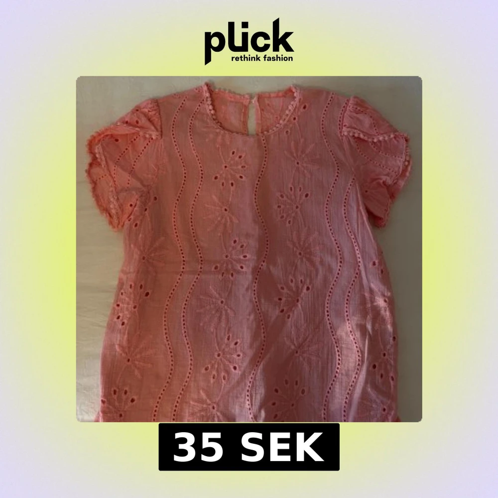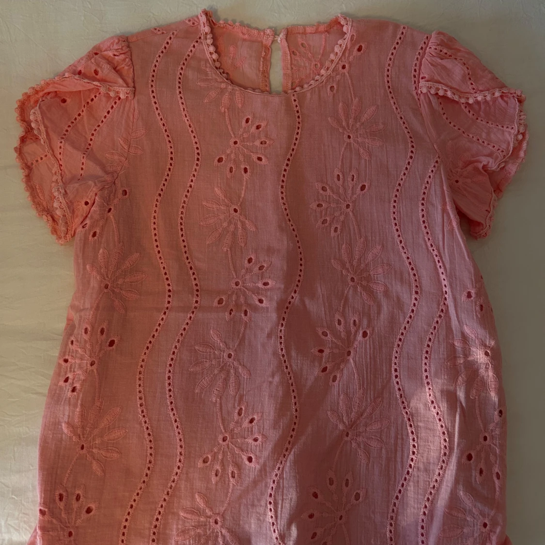 Supersöt rosa blus med korta ärmar och broderade blommor samt vågiga hålbroderier. Blusen har rund halsringning och knäppning bak i nacken. Perfekt för dig som gillar romantiska detaljer och en luftig känsla.