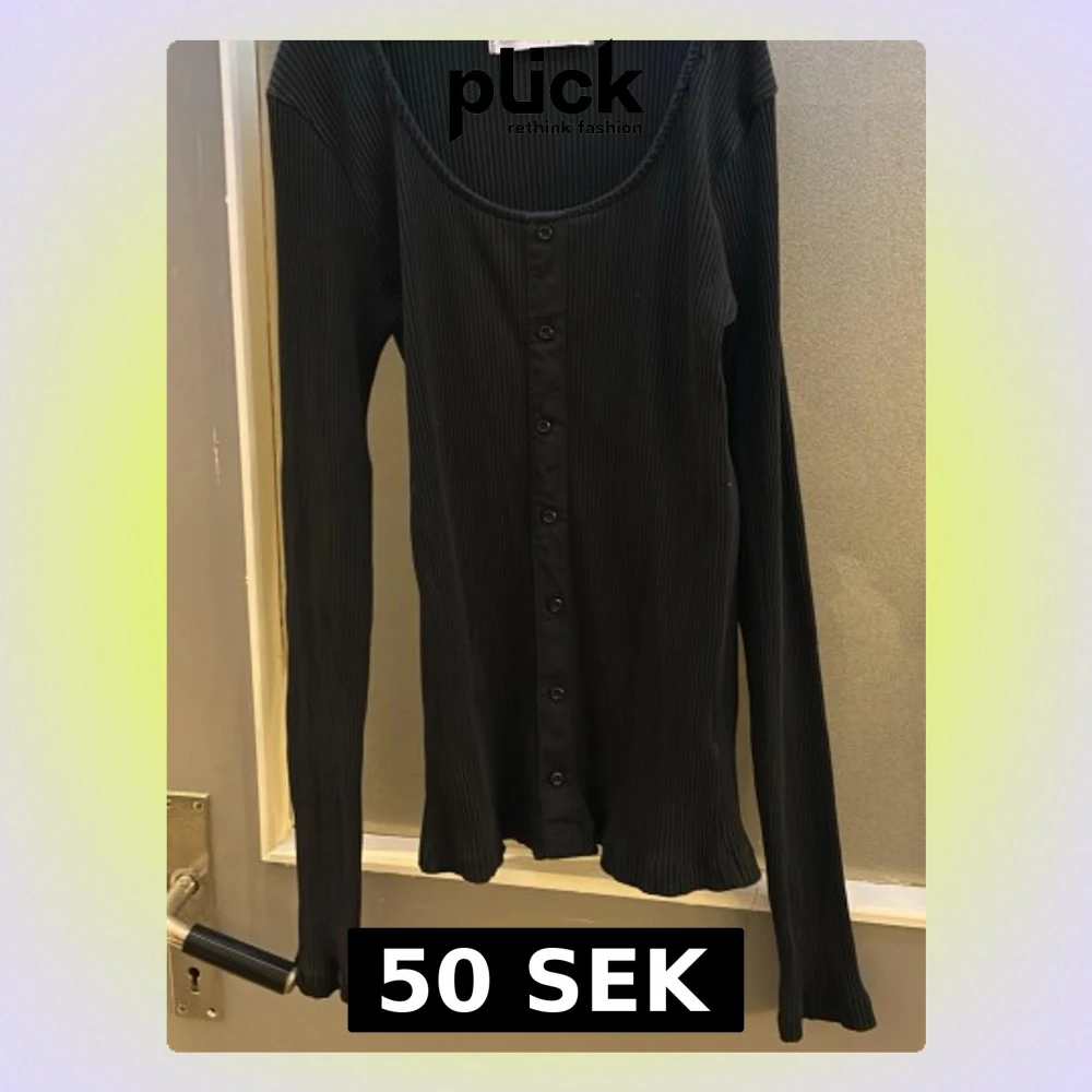 Svart långärmad topp med ribbad struktur och knappar längs hela framsidan. Snygg, enkel och passar perfekt till jeans eller kjol. Rundad halsringning och figurnära passform. (Knapparna går ej att knäppa upp)