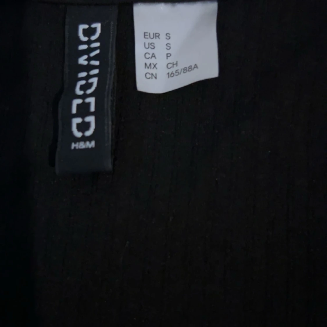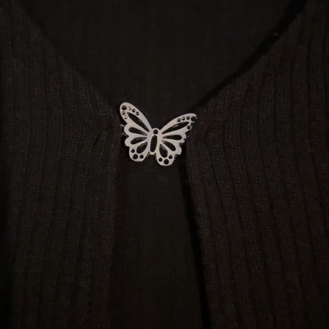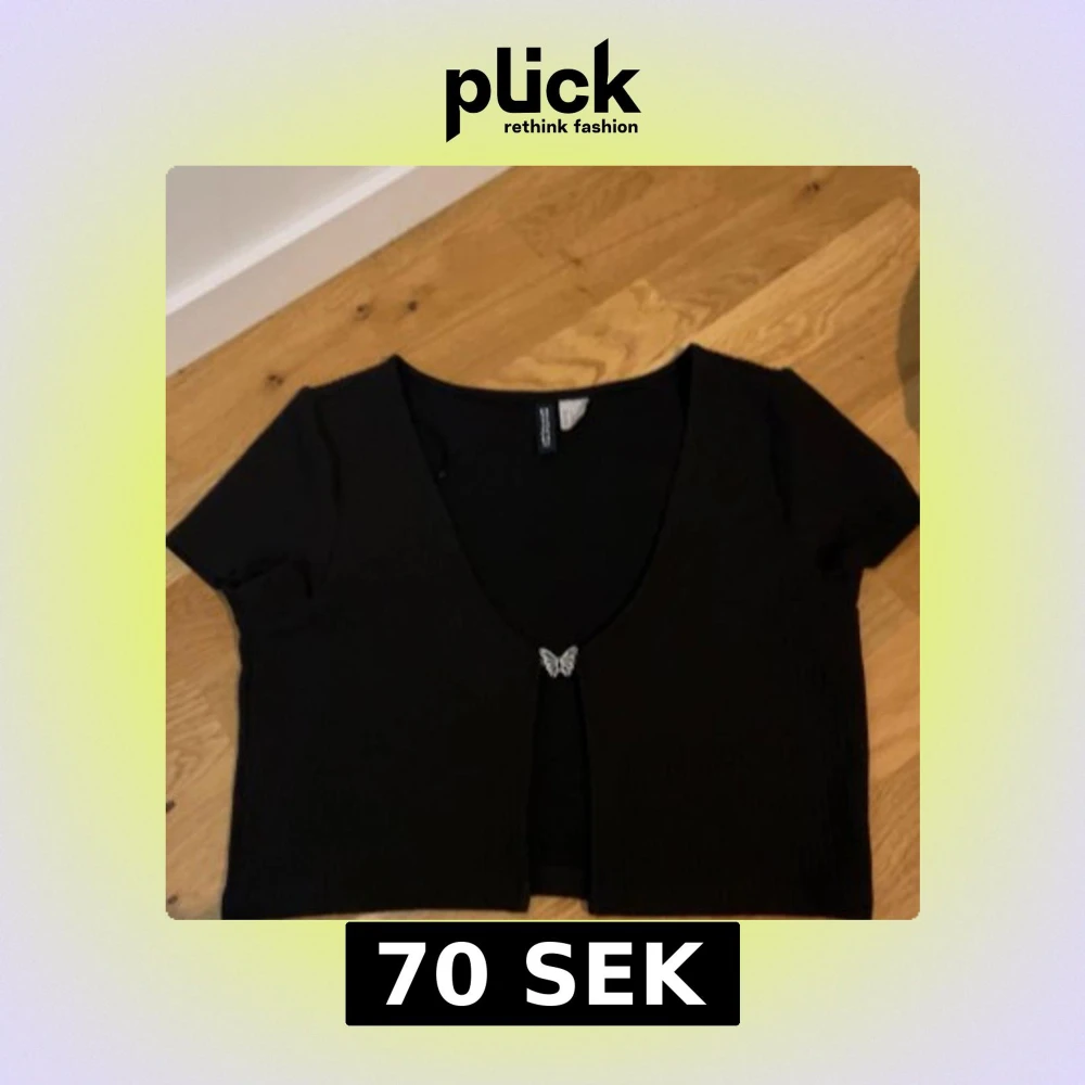 Svart croppad bolerotopp från H&M Divided med korta ärmar. Toppen är ribbad och har en söt silverfärgad fjärilsdetalj som knäppning framtill. Perfekt att styla över linne eller klänning för en trendig look.