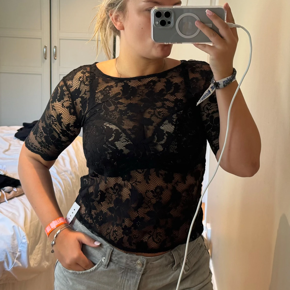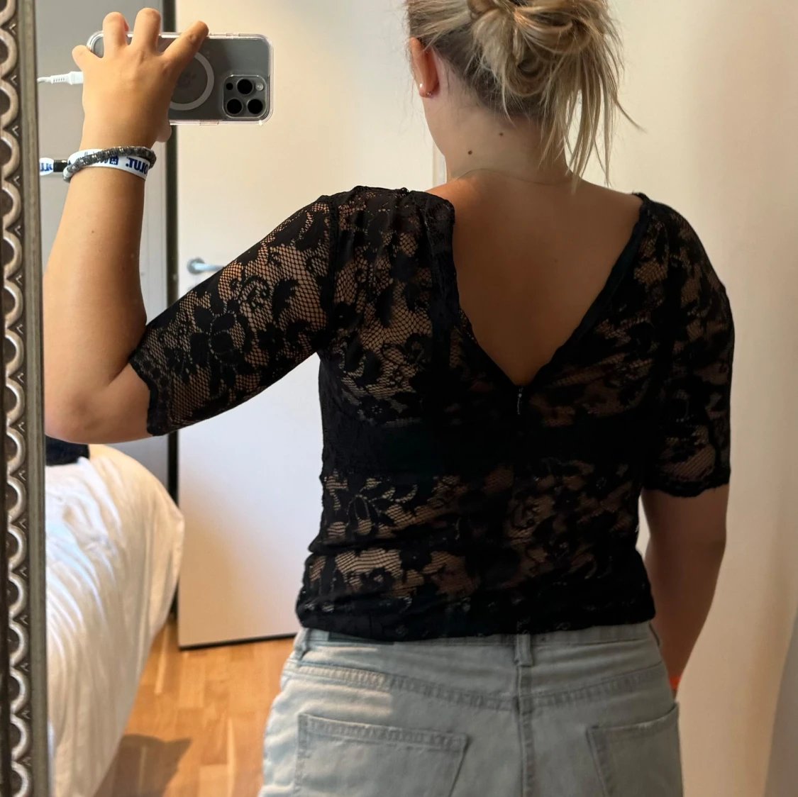 Säljer en svart, transparent spetsblus med blommigt mönster och korta ärmar. Toppen har en dragkedja i ryggen men är för liten och sitter tight mot kroppen. Perfekt för dig som gillar att sticka ut med coola detaljer och älskar blommig spets.