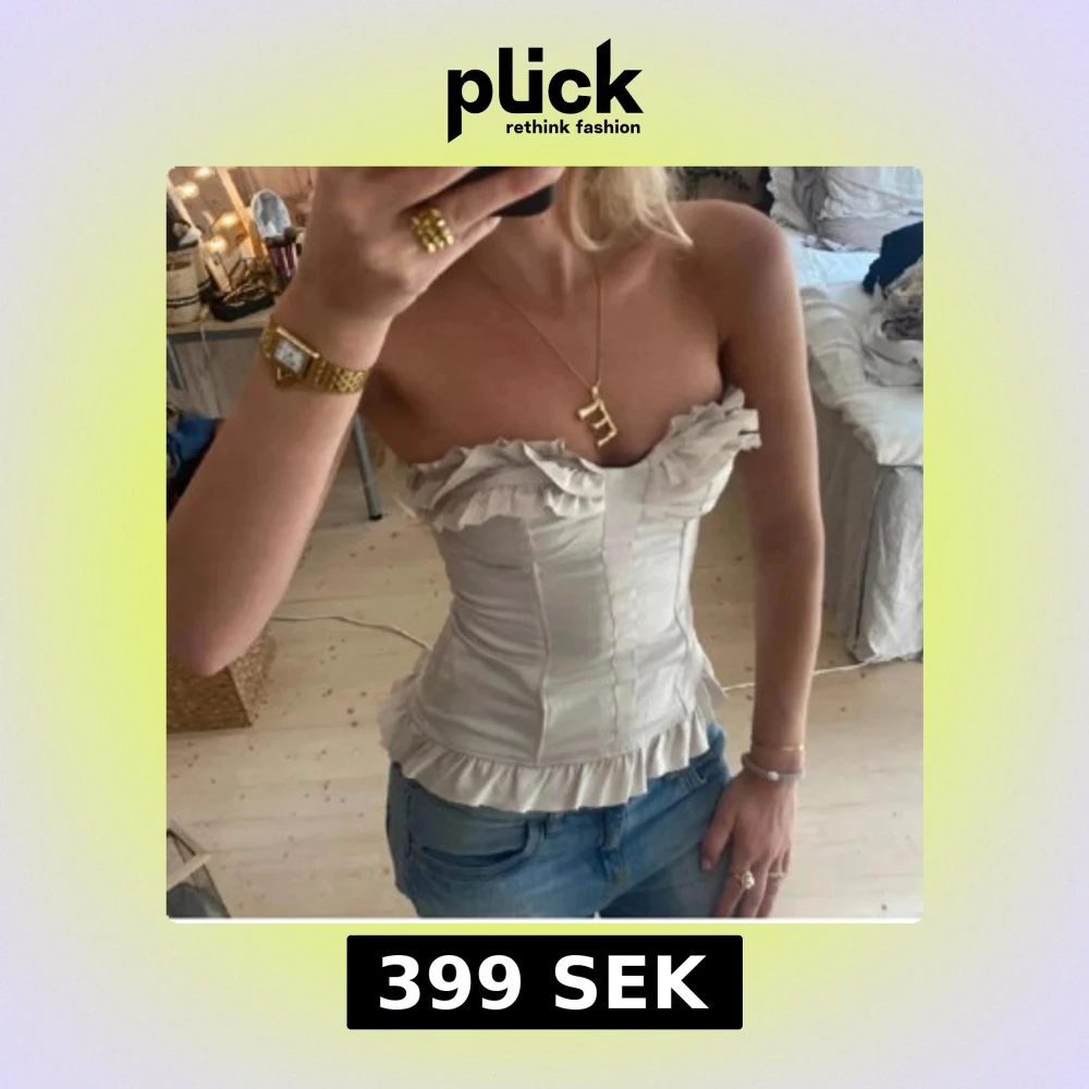 Supersnygg korsettopp med volanger längs bysten och nederkanten!! Sitter så fint och smickrande på. De två sista bilderna är mina. Ett litet hål på baksidan i yttersta tyget som syns på sista bilden men som men ej tänker på vid användning eller som påverkar funktion. Verkligen så fin!!🌟 Längd: ca 36 cm, midja: ca 37cm, byst: ca 40cm. Köp nu!!