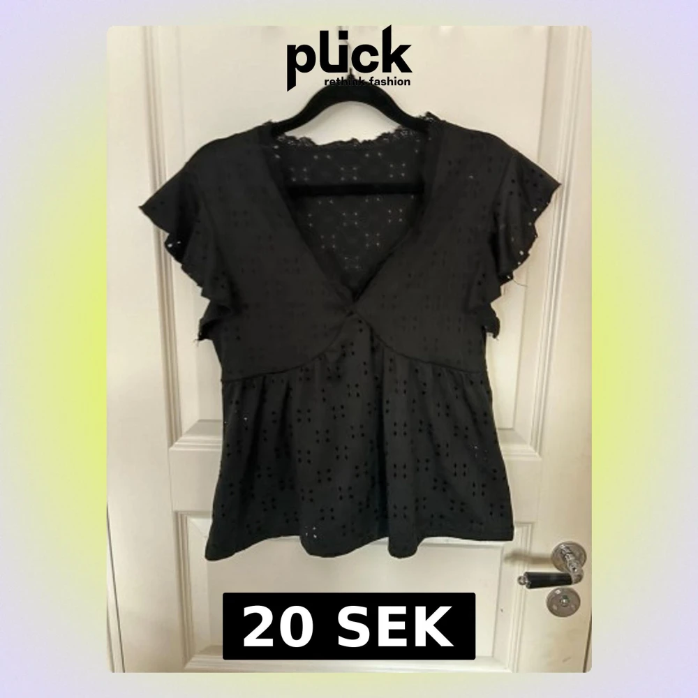 Säljer en svart blus med v-ringning och fina spetsdetaljer längs urringningen. Storlek S, använd fåtal gånger och har inga tecken på användning.