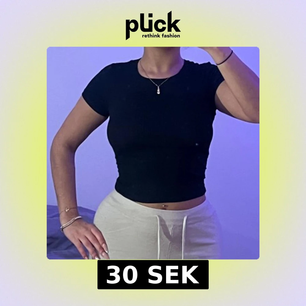 Säljer en svart croppad topp med korta ärmar och rund halsringning. Toppen är ribbad och sitter tight mot kroppen, perfekt för en stilren och enkel look.