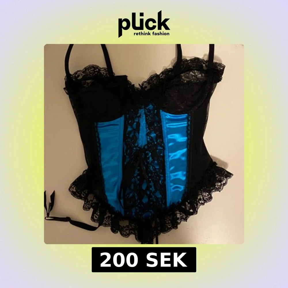 Snygg korsett i svart och blått med spetsdetaljer och snörning framtill. Den har justerbara axelband och en volangkant nedtill. Passar strl. XS-S.