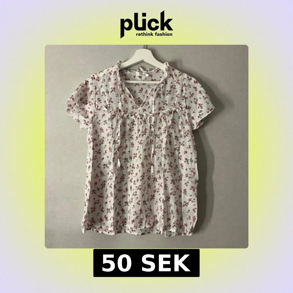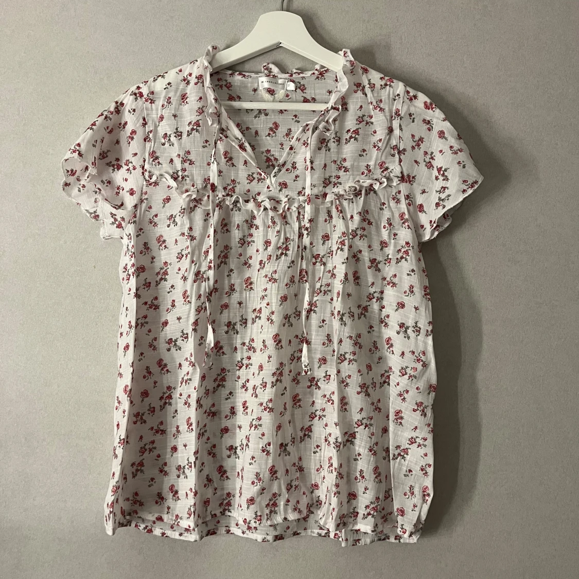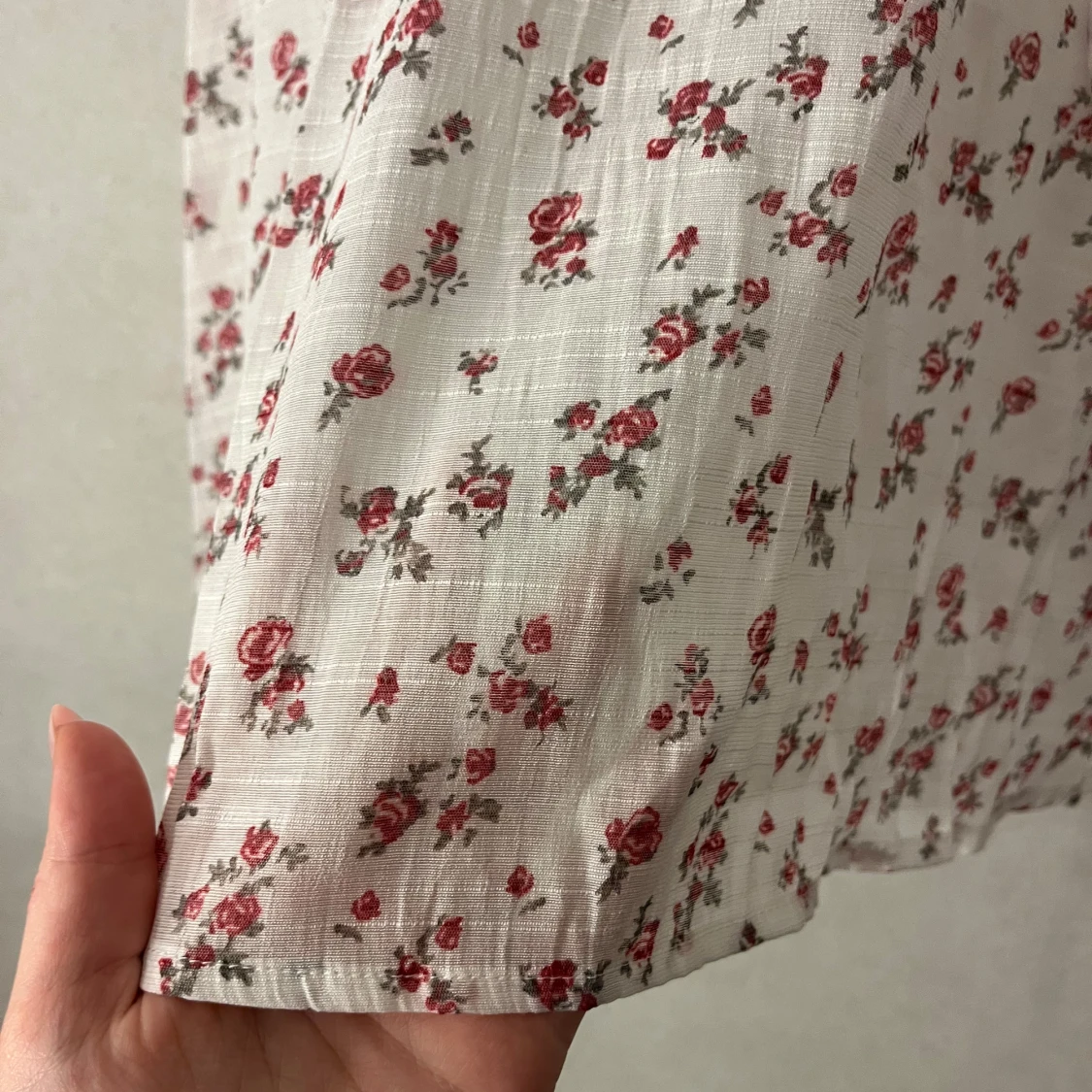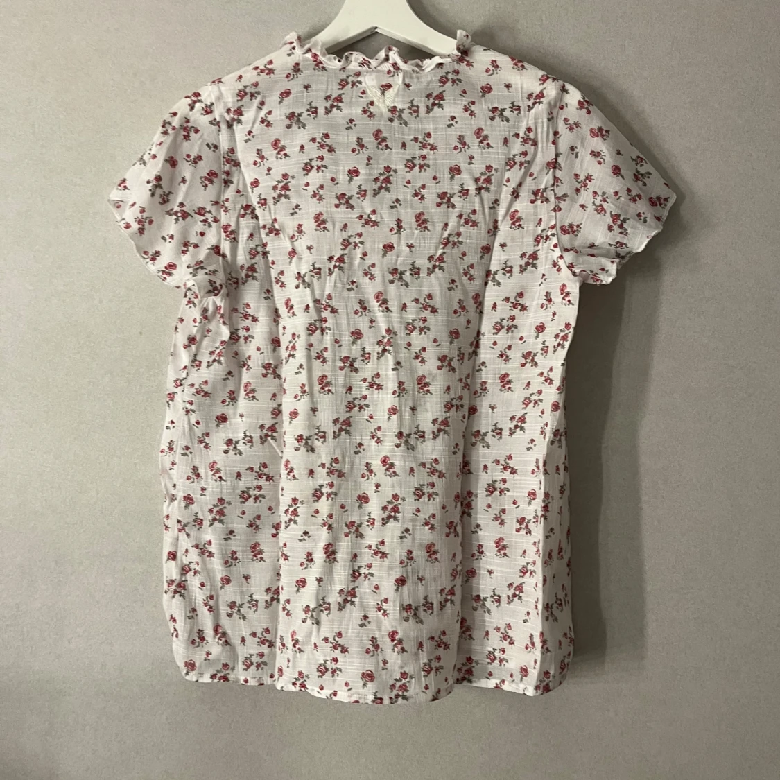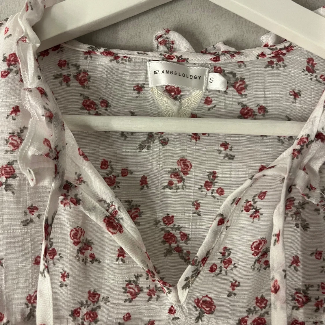 Supersöt blus i vitt från Angelology med små röda blommor och gröna blad. Blusen har korta ärmar, v-ringning med knytband och volangdetaljer vid halsen. Tunt, luftigt tyg i bomull som passar perfekt till varmare dagar. Pris kan diskuteras🤗