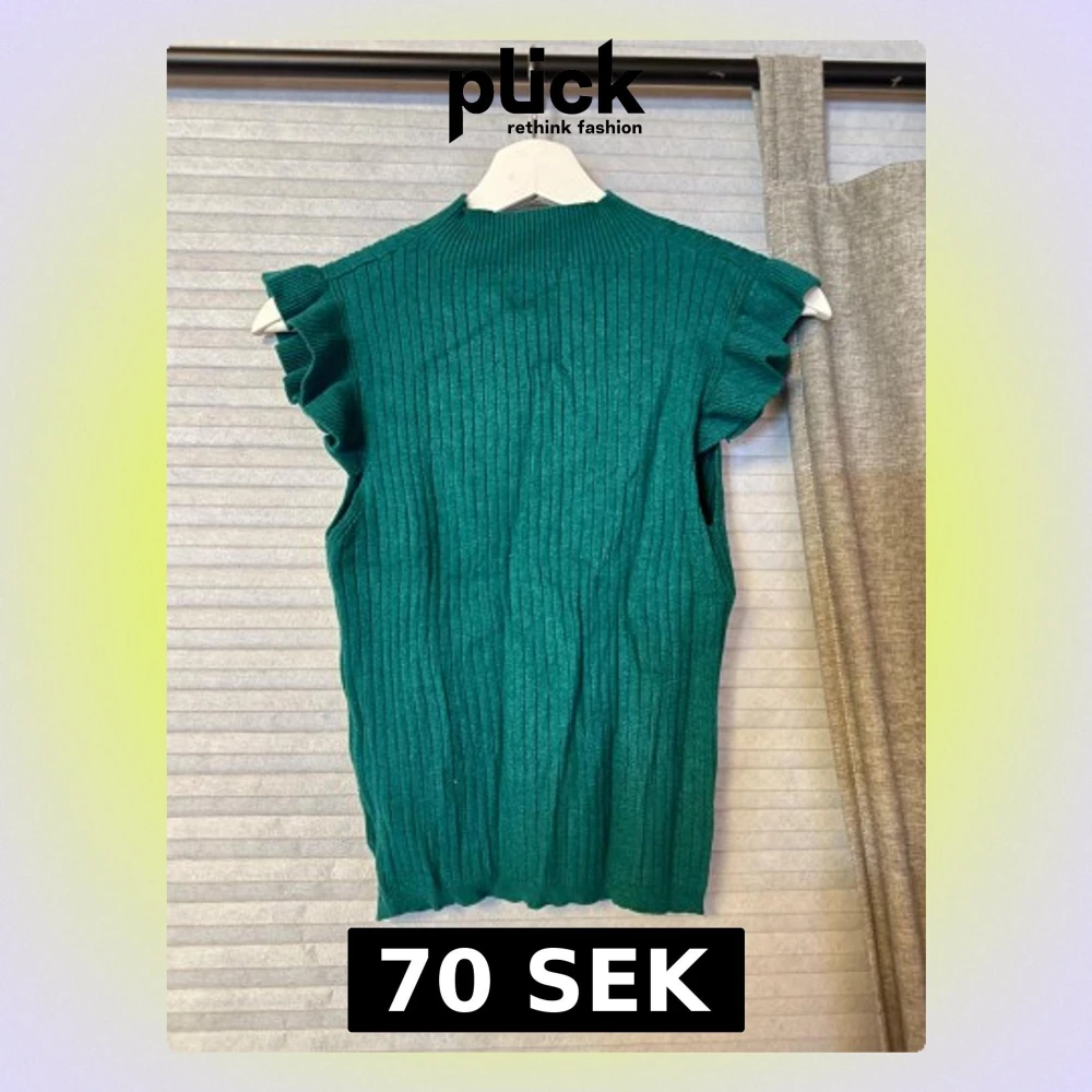 Snygg grön ribbad topp med volangdetaljer vid axlarna. Toppen är ärmlös och har en hög halsringning. Perfekt att styla med jeans eller kjol för en trendig look.