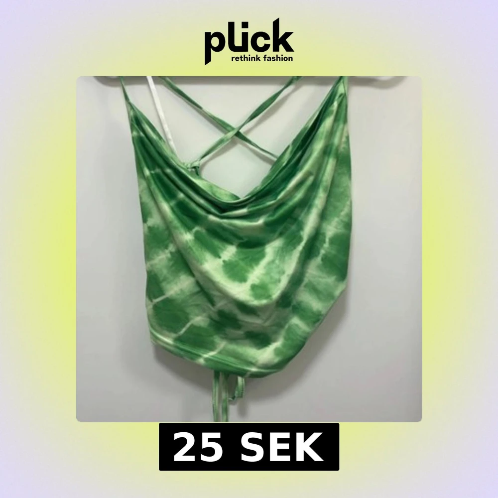 Säljer en grön och vit tie-dye croppad linnetopp med tunna axelband som korsas i ryggen och snygg snörningsdetalj baktill. Toppen har en draperad halsringning och är perfekt för sommaren.
