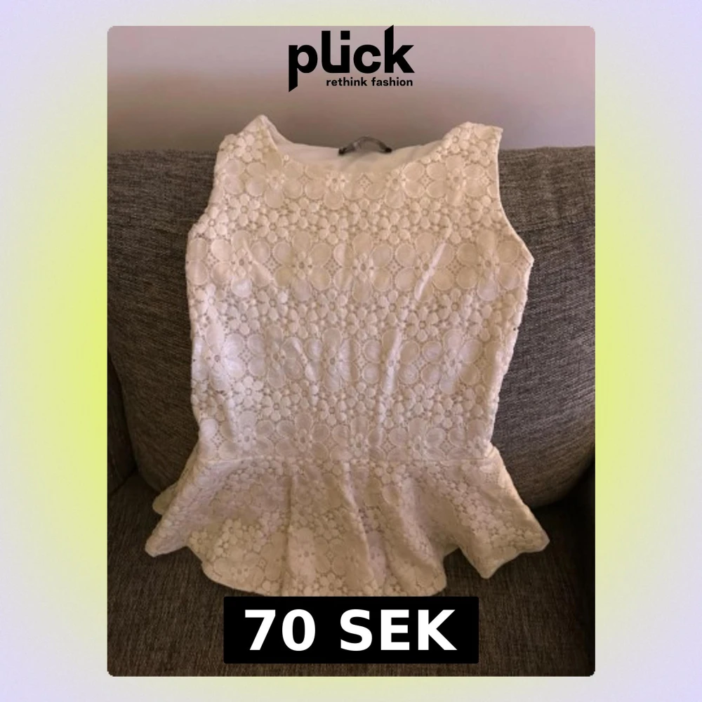 Supersöt vit topp i spets med stora blommönster och volang nertill. Ärmlös modell som ger en fräsch och somrig känsla. Perfekt att matcha med jeans eller kjol för en romantisk look.
