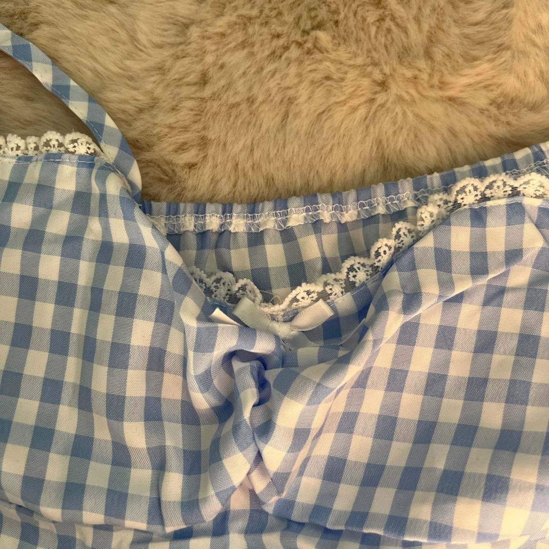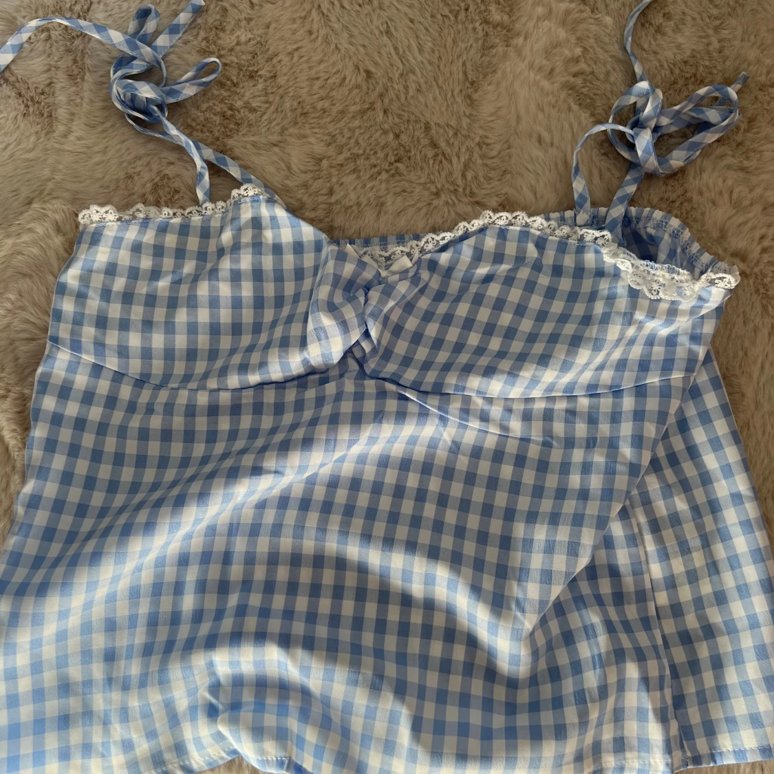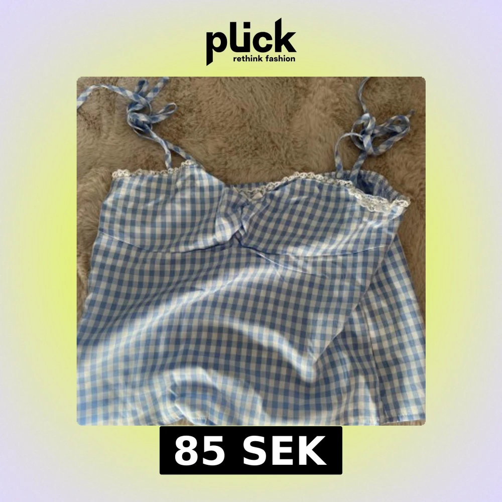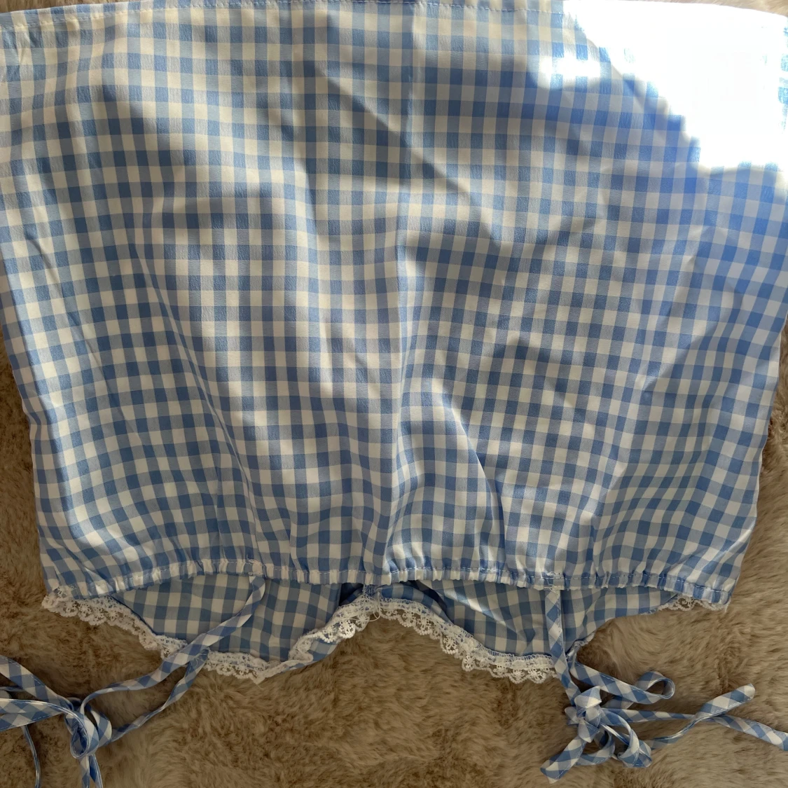 Supersöt blåvit rutig linnetopp med tunna knytband och spetsdetaljer längs kanten. Toppen har en liten rosett framtill och är gjord i ett lätt material som känns perfekt för varma dagar. Passar dig som gillar en romantisk och somrig stil.🫰🏼Kom inte till någon användning därför söljer jag den😉