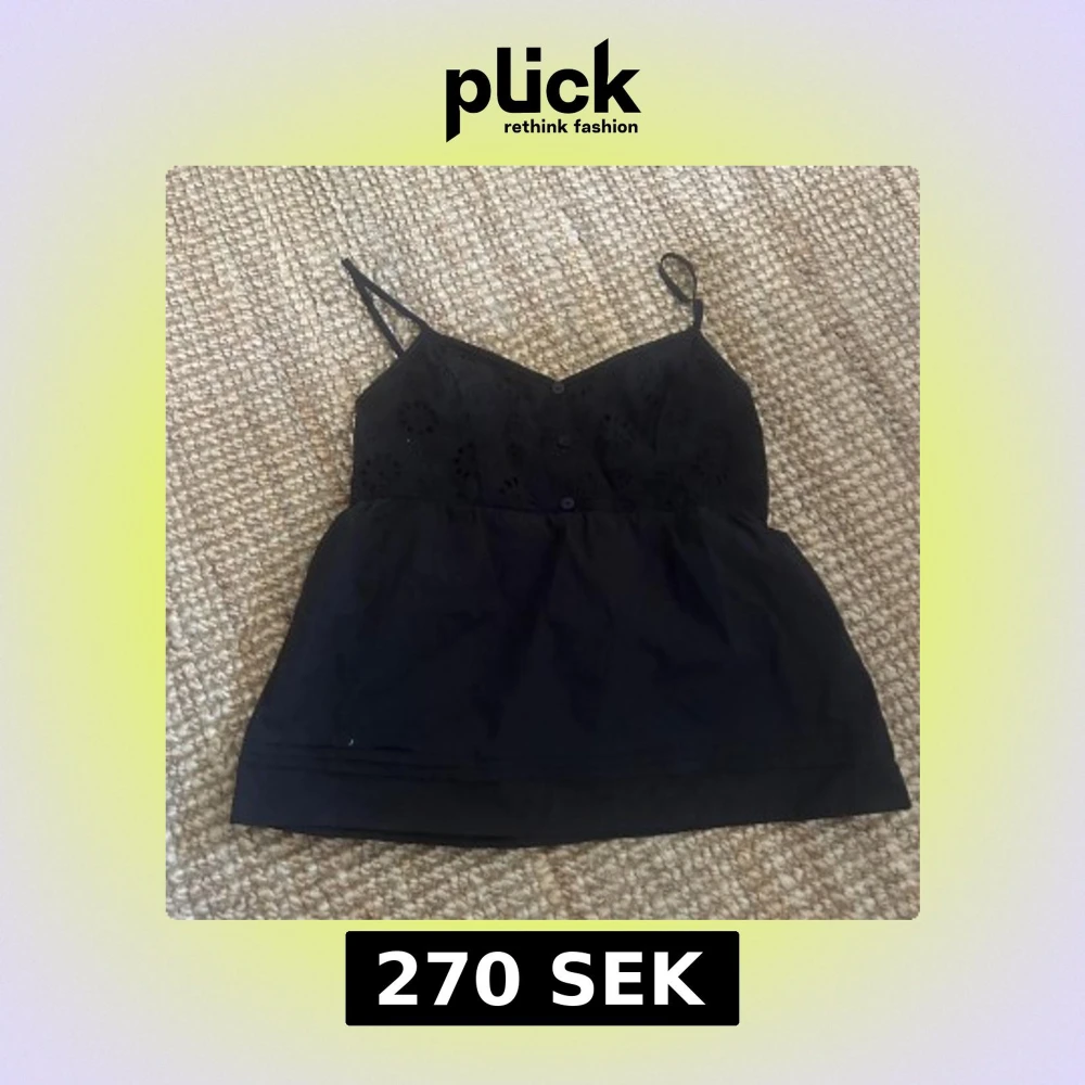 Svart topp med tunna axelband och broderade blommor på överdelen. Toppen har små knappar framtill och en volang nedtill.