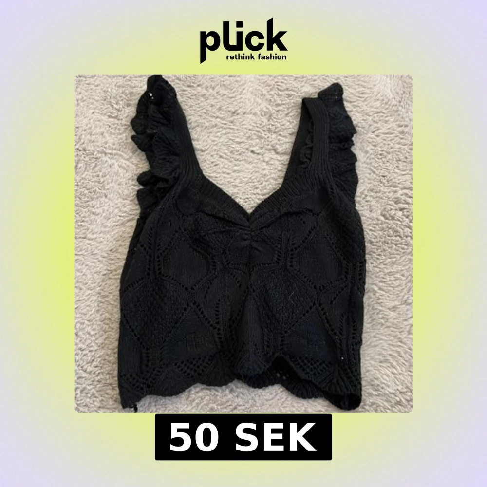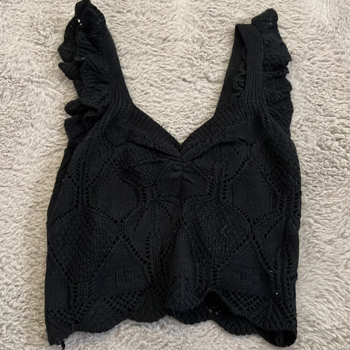Supersnygg svart stickad linnetopp med breda axelband och volangdetaljer. Toppen har ett unikt mönster och v-ringad hals. Perfekt att styla med jeans eller kjol för en cool look.