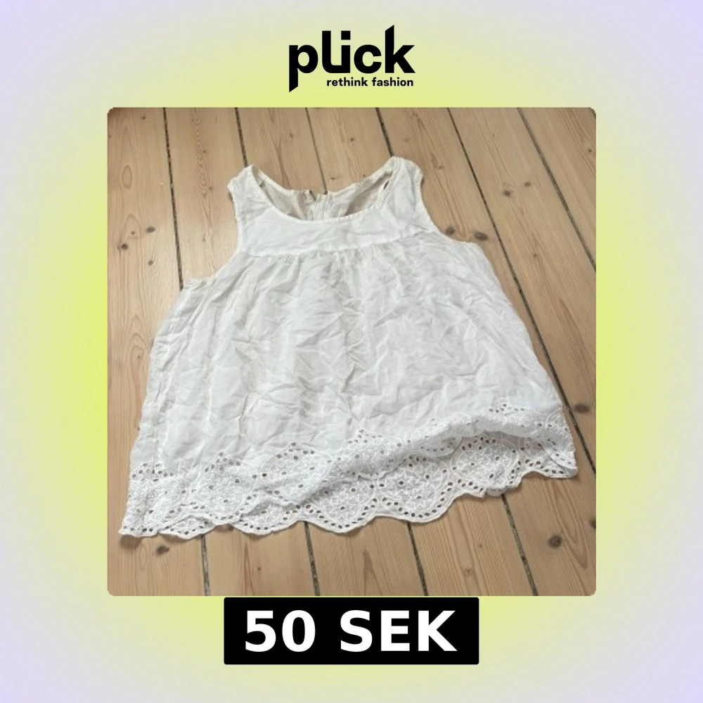 Söt vit ärmlös linnetopp med broderad spetskant nertill och rund halsringning. Toppen har en synlig dragkedja i ryggen som ger en cool detalj. Perfekt för varma dagar och enkel att styla till jeans eller kjol.