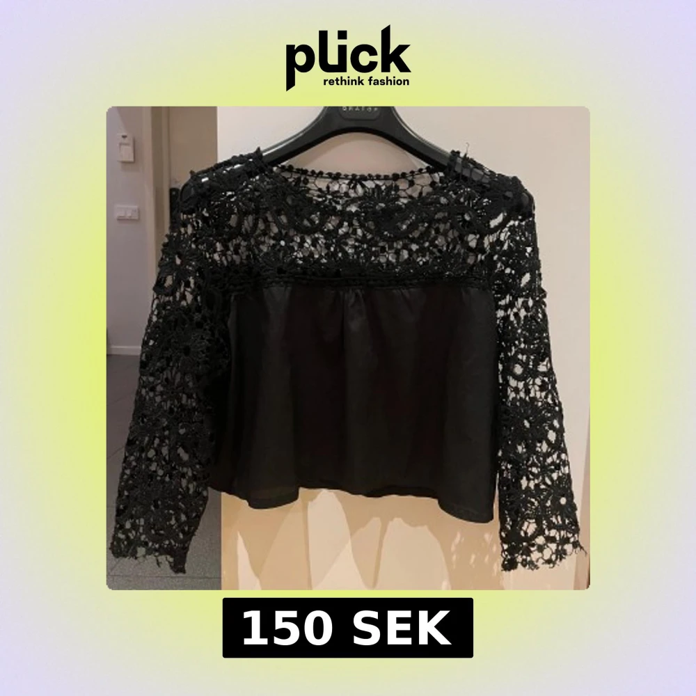 Elegant svart blus med spetsdetaljer och långa ärmar. Perfekt för en stilfull look med en unik design som kombinerar spets och ett slätt tyg. Passar bra till både jeans och kjol.