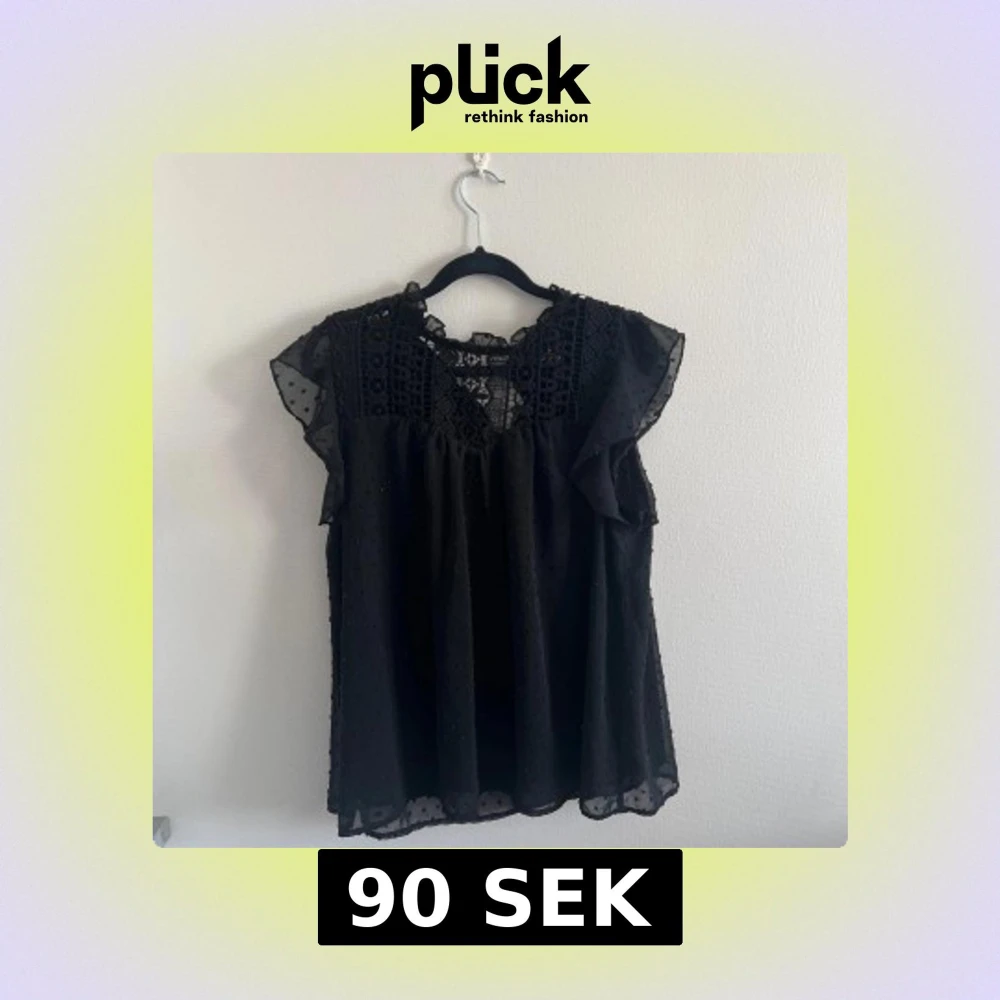 Säljer en svart blus med v-ringning, spetsdetaljer upptill och volang vid ärmarna. Blusen är ärmlös med lätt transparent tyg och små prickar i materialet. Perfekt för dig som gillar romantiska detaljer.