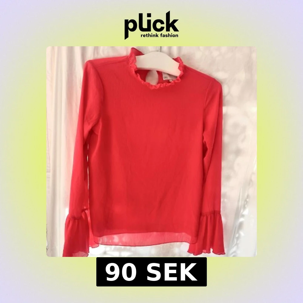 Säljer en snygg röd blus från DC Studio med volangdetaljer vid halsringningen och ärmsluten. Blusen har långärmade ärmar med extra vidd nedtill och är tillverkad i ett lätt, transparent tyg med underline är insytt.