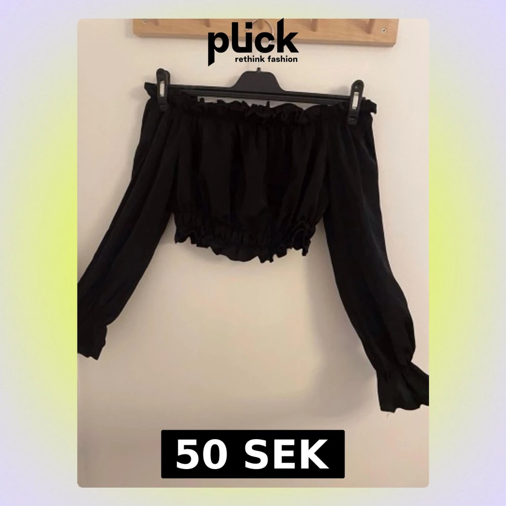 Svart offshoulder topp med långa ärmar och croppad passform. Toppen har resår vid axlar och midja för en snygg rynkad effekt och volangdetaljer upptill och nedtill. Perfekt för dig som vill ha en stilren men ändå edgy look.