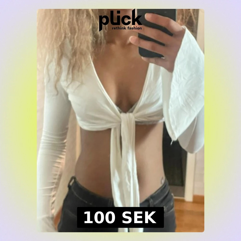 Säljer en vit croppad omlottopp med långa ärmar och knyt framtill. Toppen har djup v-ringning och är perfekt för dig som vill ha en trendig och stilren look. Passar till både jeans och kjol för en cool vibe. Den har ett till hål/remma där man kan knyta ifall det behövs
