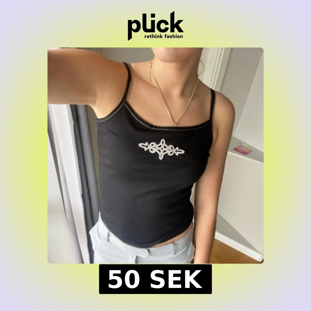 Snygg svart linnetopp med smala axelband och vit broderad detalj framtill.