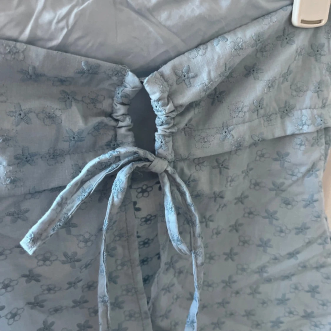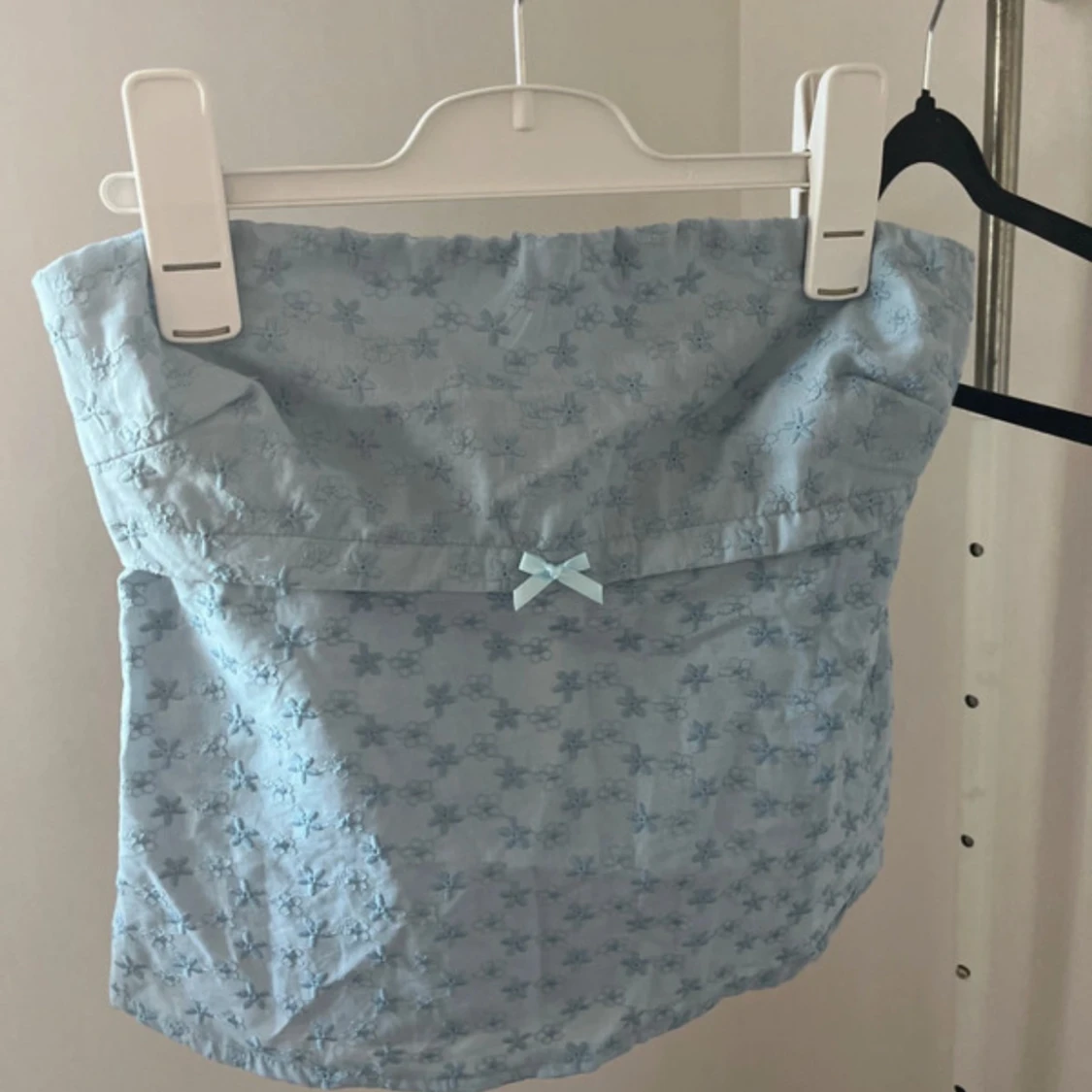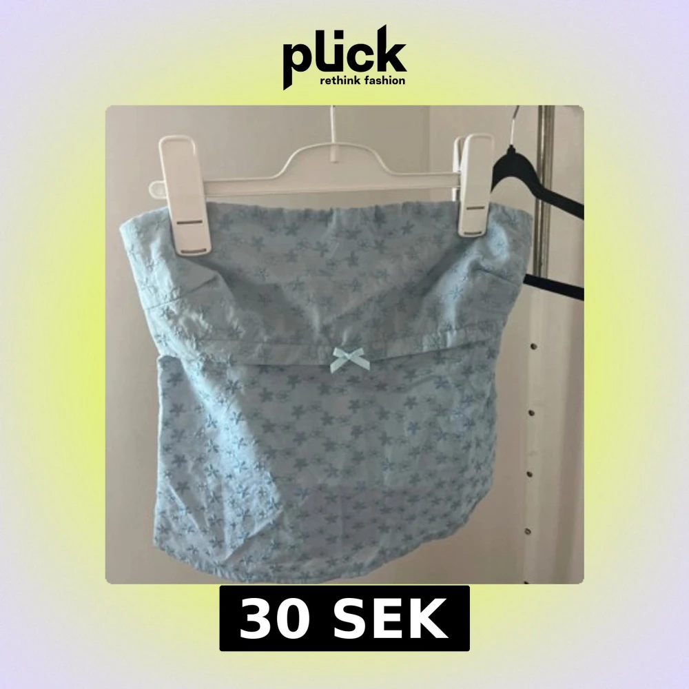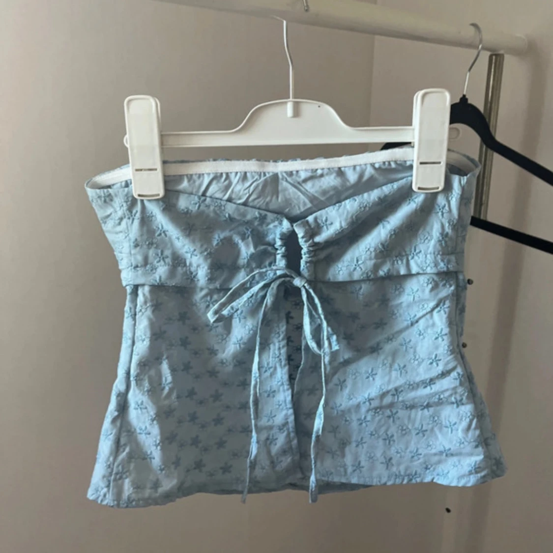 Supersöt ljusblå bandeau tubtopp med broderade blommor och liten rosett framtill. Toppen har snörning och knyt i ryggen för extra snygg passform.
