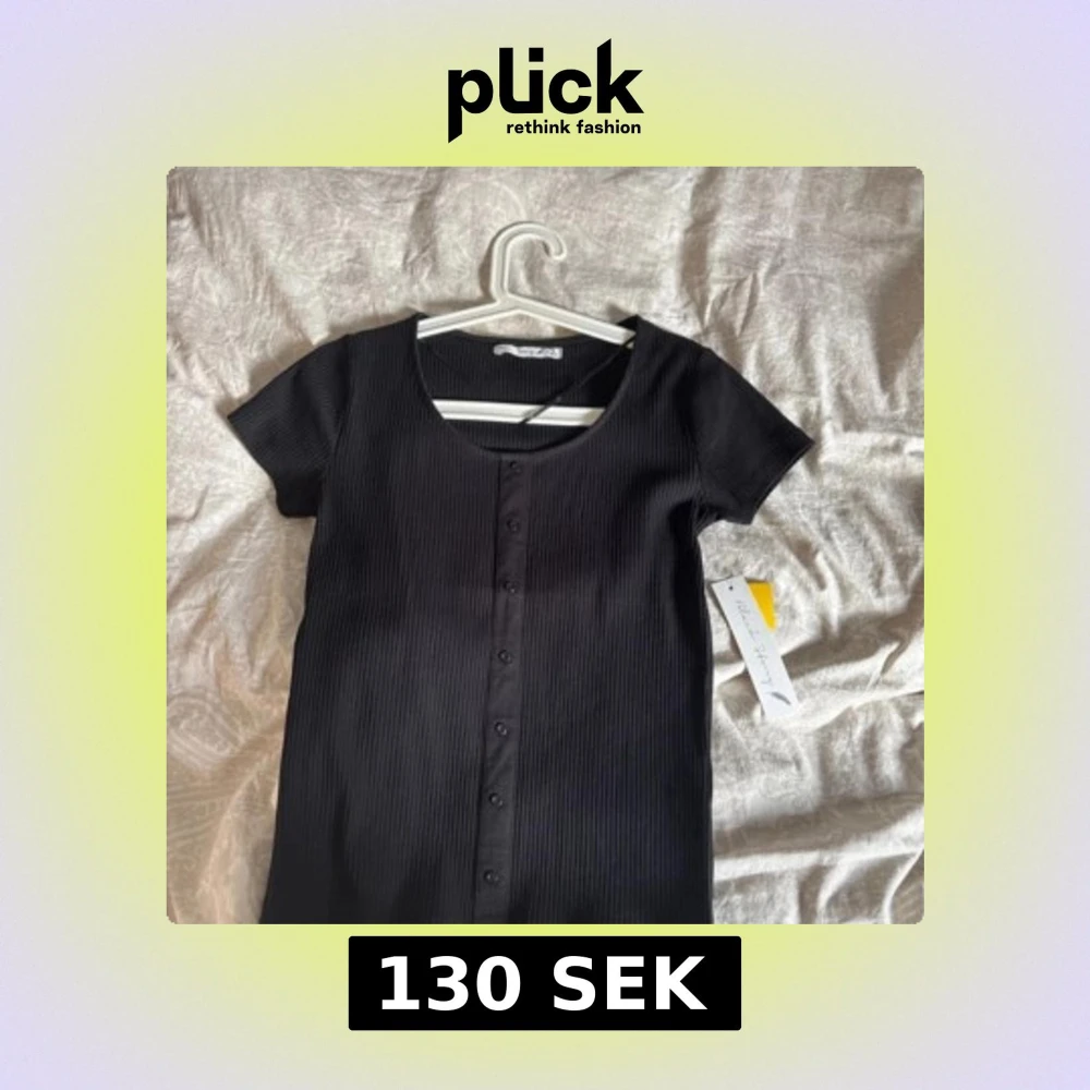 Säljer en svart ribbad topp från Gina Tricot med korta ärmar och knappar framtill. Toppen har en rundad halsringning och är figurnära i modellen. Perfekt att styla till olika outfits.