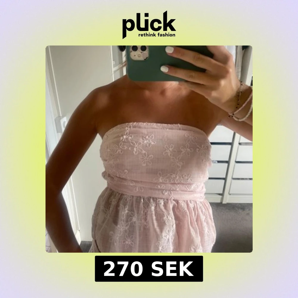 Superfin ljusrosa bandeau tubtopp med broderade vita blommor och lätt volang nedtill. Toppen är axelbandslös.