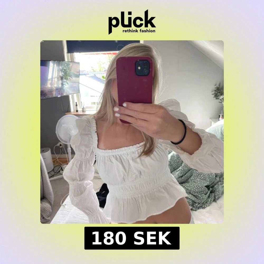 Supersöt vit blus från H&M med puffiga långärmar och smock i midjan. Blusen har fyrkantig ringning, volangkant nertill och är gjord i tunn bomull. Perfekt för dig som gillar en luftig och skön topp! 💞