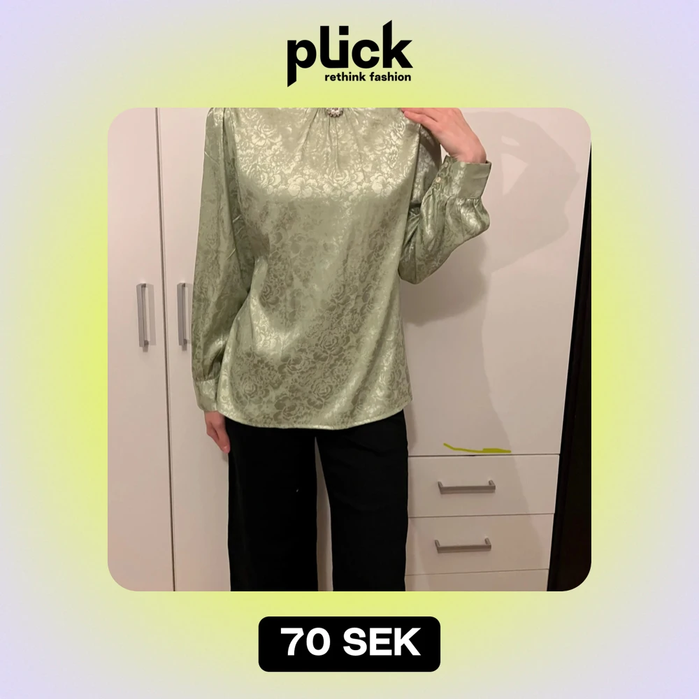 Säljer en elegant grön blus med ett subtilt mönster. Blusen har långa ärmar och en hög krage med en dekorativ broschdetalj. Perfekt för både vardag och festliga tillfällen. Materialet ser ut att vara glansigt, vilket ger en lyxig känsla.