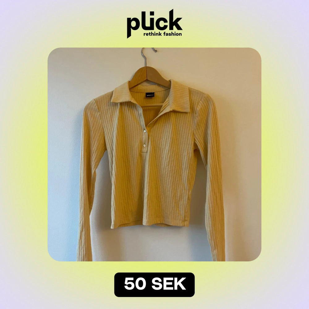 Säljer en beige ribbad tröja. Den har en snygg krage och knappar framtill. Tröjan är lite croppad och har långa ärmar, vilket gör den perfekt för höst och vår.