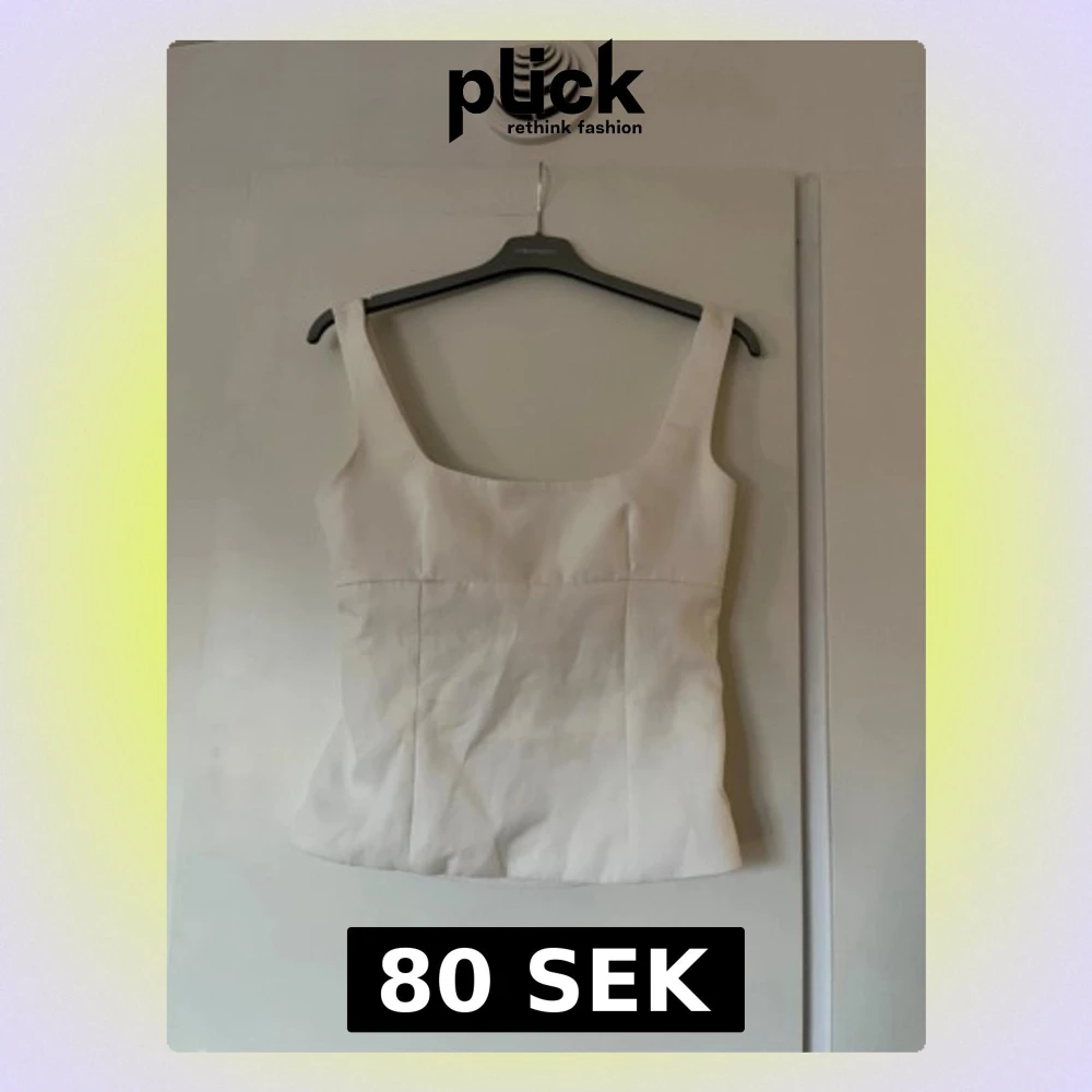 Säljer en stilren vit linnetopp med breda axelband och fyrkantig ringning. Toppen har en stor rosett och öppen detalj i ryggen.