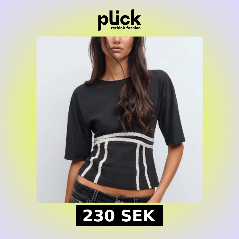 Svart topp med halvkort ärm och vita, pärlliknande dekorativa linjer som ger en cool kontrast. Toppen har en croppad passform och rund hals. Perfekt för dig som gillar stilrena plagg med en twist.