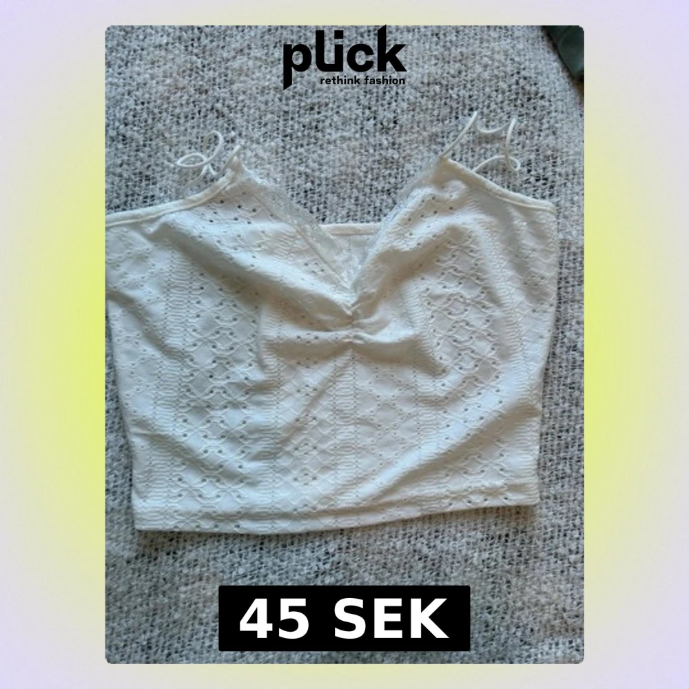 Söt vit croppad linnetopp med tunna axelband och spetsdetaljer. Toppen har ett broderat hålmönster och en lätt v-ringad form med rynk framtill. Perfekt för sommarens alla tillfällen!