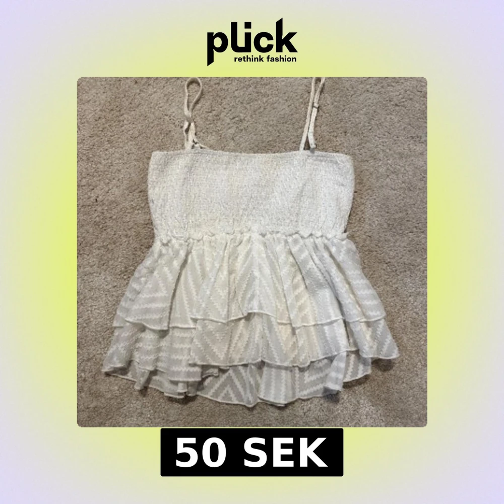 Säljer en söt vit linnetopp från SHEIN med tunna axelband och flera lager volanger nedtill. Toppen har ett diskret mönster och smockad överdel som ger en bekväm passform. Perfekt för dig som gillar en feminin och luftig stil.
