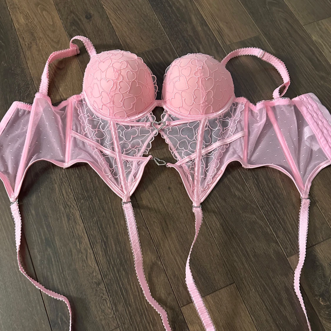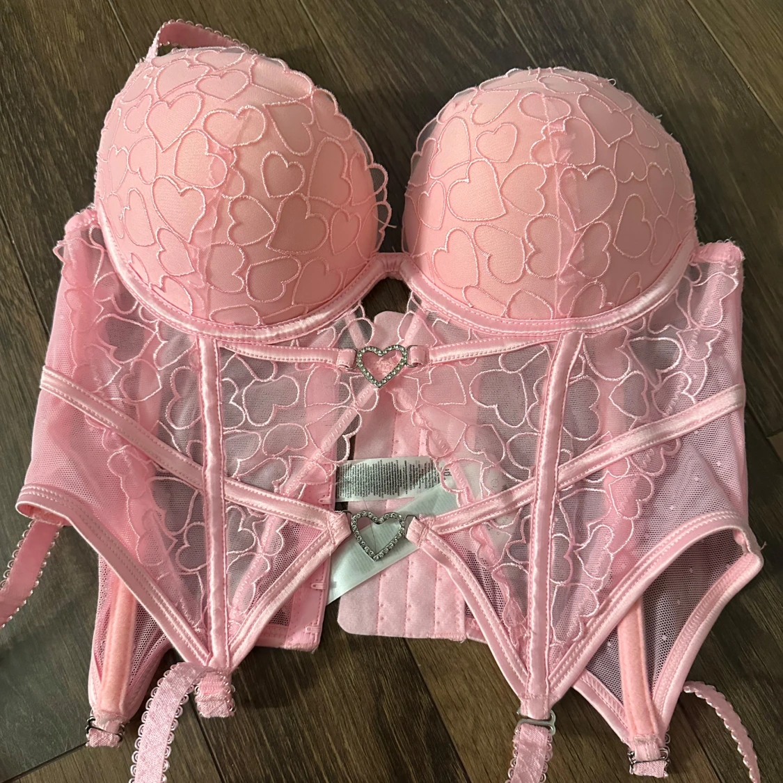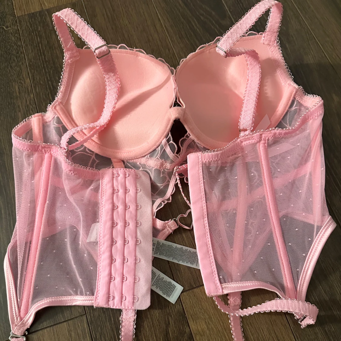 Säljer en söt rosa korsett med vadderade kupor och hjärtmönster. Den har justerbara axelband och en dekorativ hjärtformad detalj framtill. Baksidan har en rad med hyskor för justering. Perfekt för en romantisk look. Aldrig använd