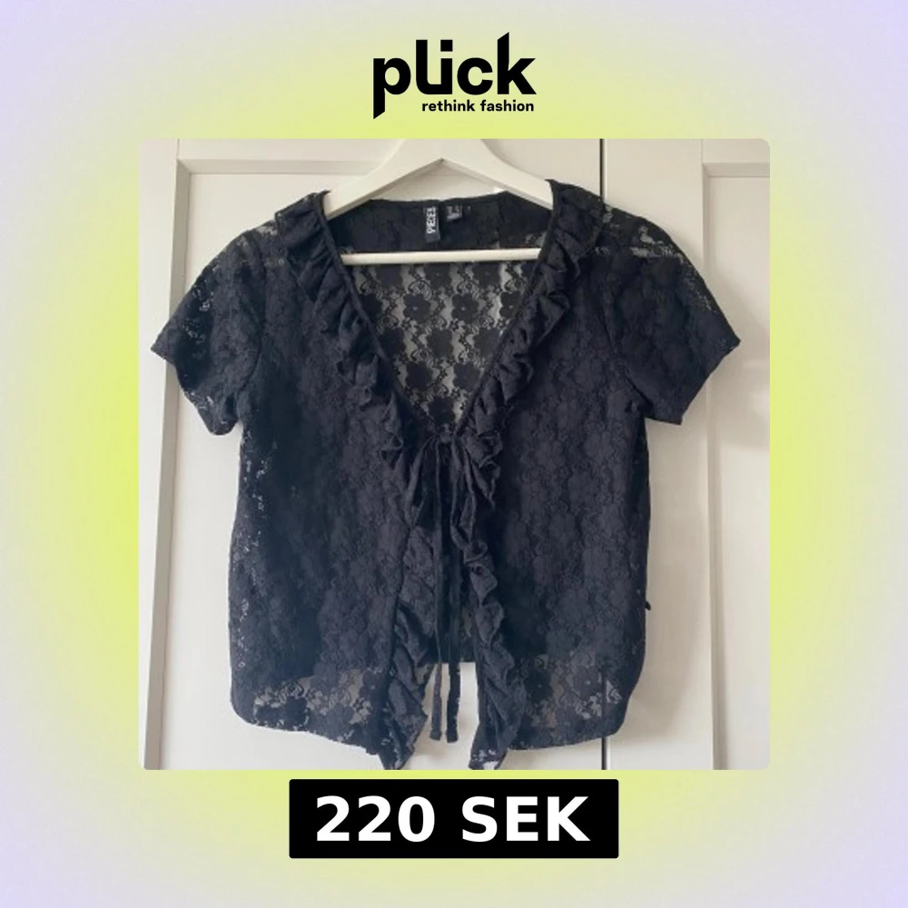 Supersöt svart blus i spets från Pieces med kort ärm, volangkant längs v-ringningen och knyt framtill. Blommigt spetsmönster ger en romantisk vibe och toppen är lätt transparent. Perfekt att styla lager på lager eller med ett linne under. Använt en gång, nypris 340kr💕