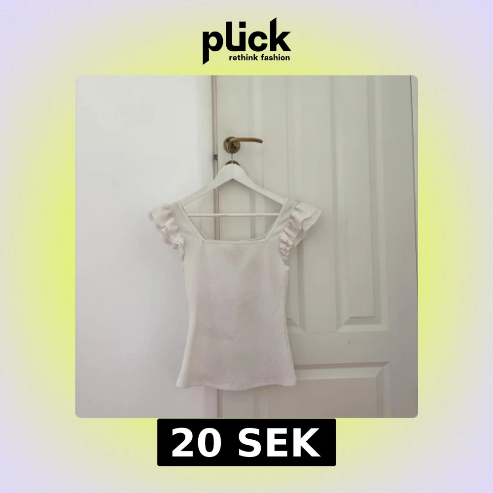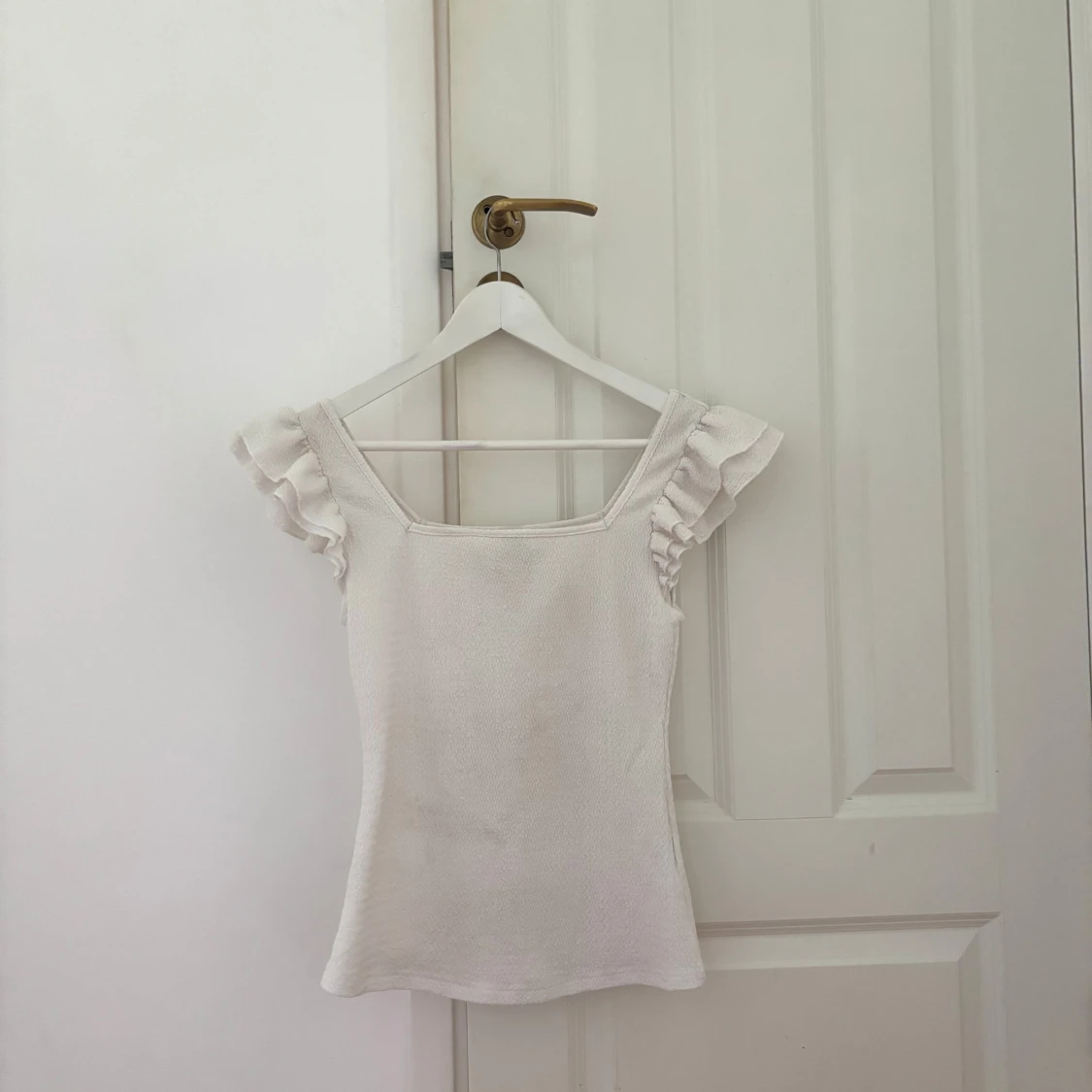 Supersöt vit topp med fyrkantig ringning och volangdetaljer på axlarna. Toppens material känns mjukt och stretchigt, perfekt för en fräsch och stilren look. Passar lika bra till jeans som kjol och ger en romantisk vibe.