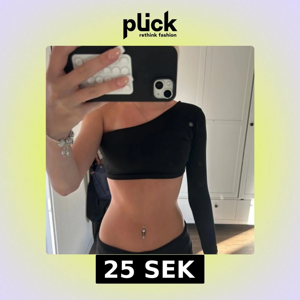 Säljer en svart croppad topp med one shoulder-design och lång ärm på ena sidan. Toppen är ribbad och sitter tight, perfekt för dig som gillar en edgy och trendig look. Materialet känns mjukt och stretchigt, vilket gör den bekväm att bära.