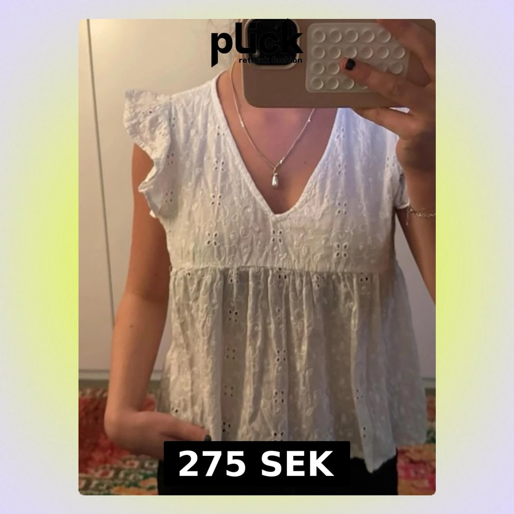 Söt vit blus med broderade spetsdetaljer och volangärmar. Blusen har v-ringning