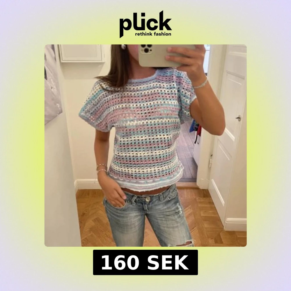 Superfin virkad topp i pastellfärger med korta ärmar. Toppen har ett luftigt, hålmönstrat stickat mönster i lila, blått, vitt och ljusrosa. Rund halsringning och är köpt här på plik men inte kommit till användning. 💗Materialet känns mjukt och svalt.