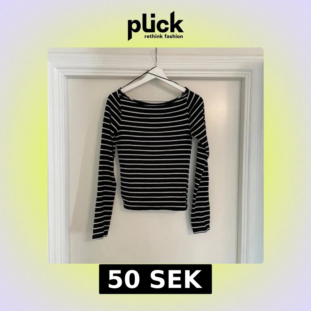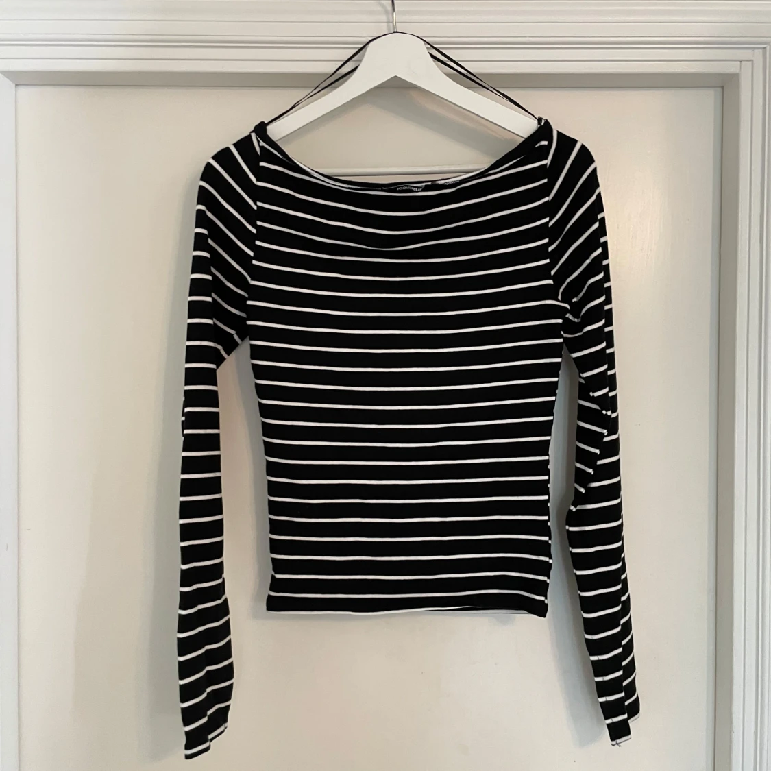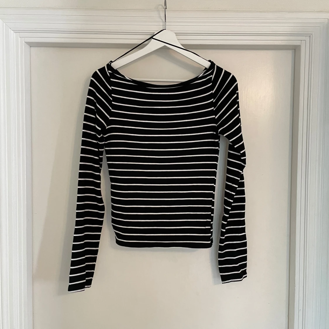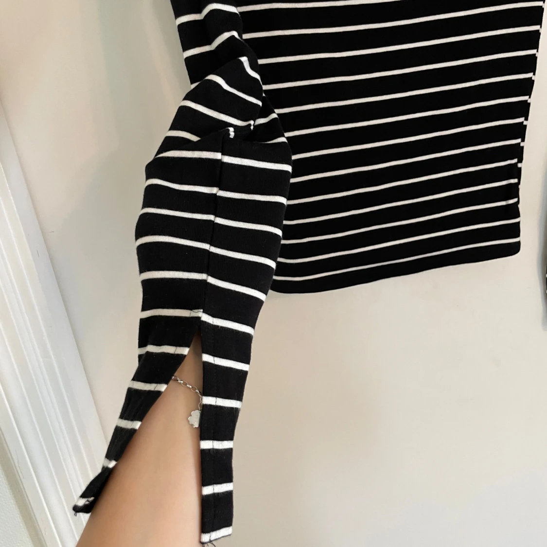 Svart långärmad topp med vita horisontella ränder och slits vid ärmsluten. Snygg, enkel och passar perfekt till jeans eller kjol. Mjuk och stretchig bomullskänsla med en klassisk rund halsringning.