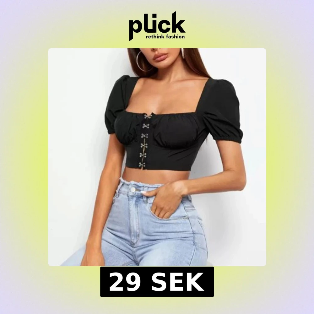 Snygg svart croppad topp med puffiga korta ärmar och fyrkantig urringning. Framsidan har dekorativa hakar som ger en cool detalj. Perfekt att styla med höga jeans för en trendig look.