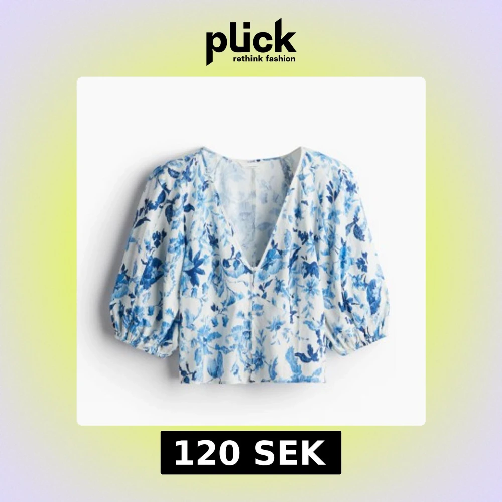 Säljer en vit blus med blått blommönster. Blusen har trekvarts puffärmar och knappar framtill.