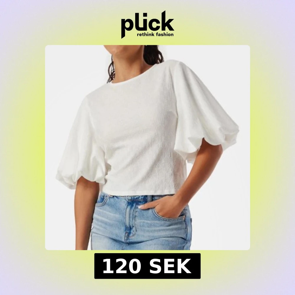Säljer en vit blus med stora puffärmar och rund halsringning. Toppen har en croppad passform och är tillverkad i ett lätt material som passar perfekt till jeans eller kjol. 🩷