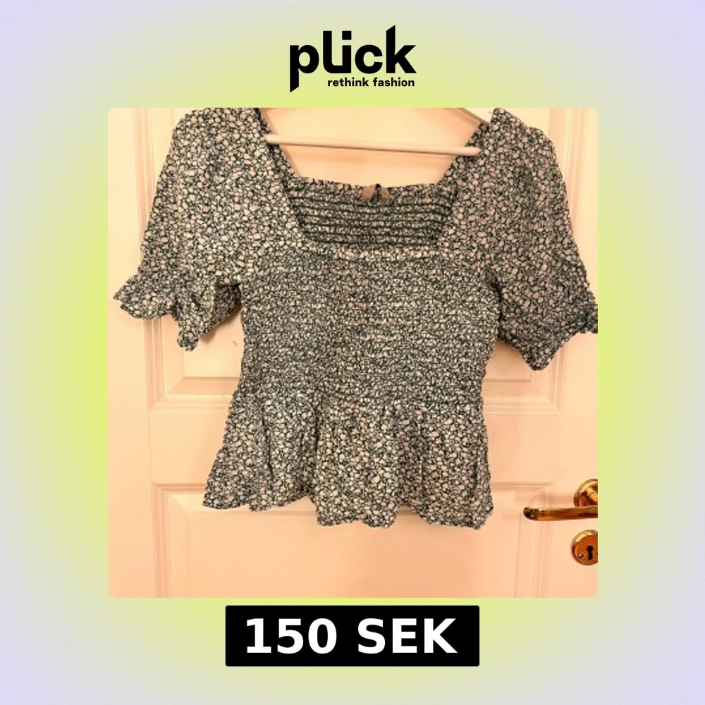 Supersöt blommig blus i grön och vitt med smockad överdel och volang nertill. Puffiga korta ärmar och liten rosett framtill. Perfekt till jeans eller kjol för en trendig look.