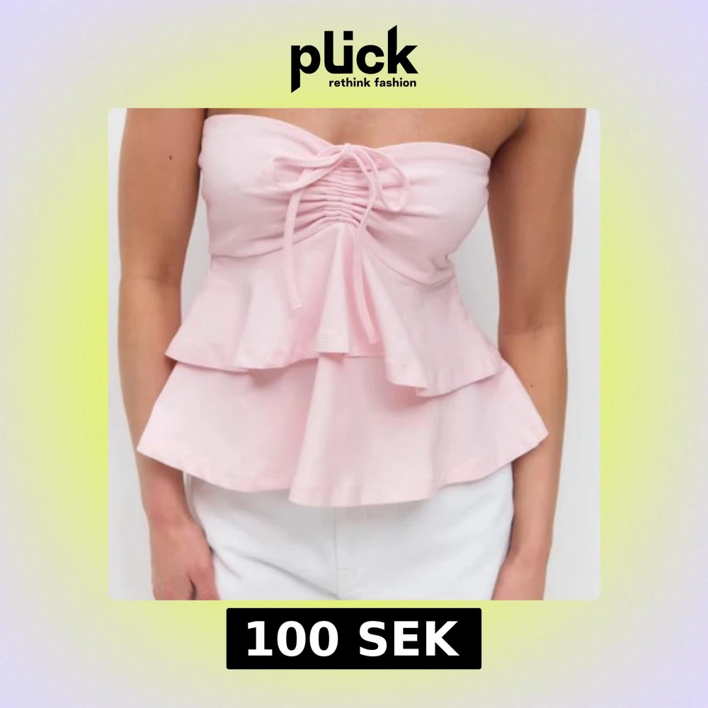 Supersöt ljusrosa bandeau tubtopp med volangkant och knyt framtill. Toppen är ärmlös och har en feminin, flowy passform som passar perfekt till sommaren. Tillverkad i mjukt bomullstyg för en bekväm känsla.