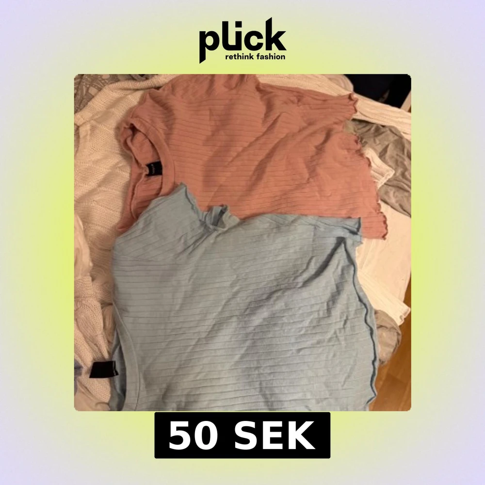 Två snygga ribbade toppar från SHEIN i storlek S. En är ljusblå och den andra är ljusrosa, båda med kort ärm och vågig kant vid ärmslut och nederkant. Perfekta att matcha med jeans eller kjol för en chill look.