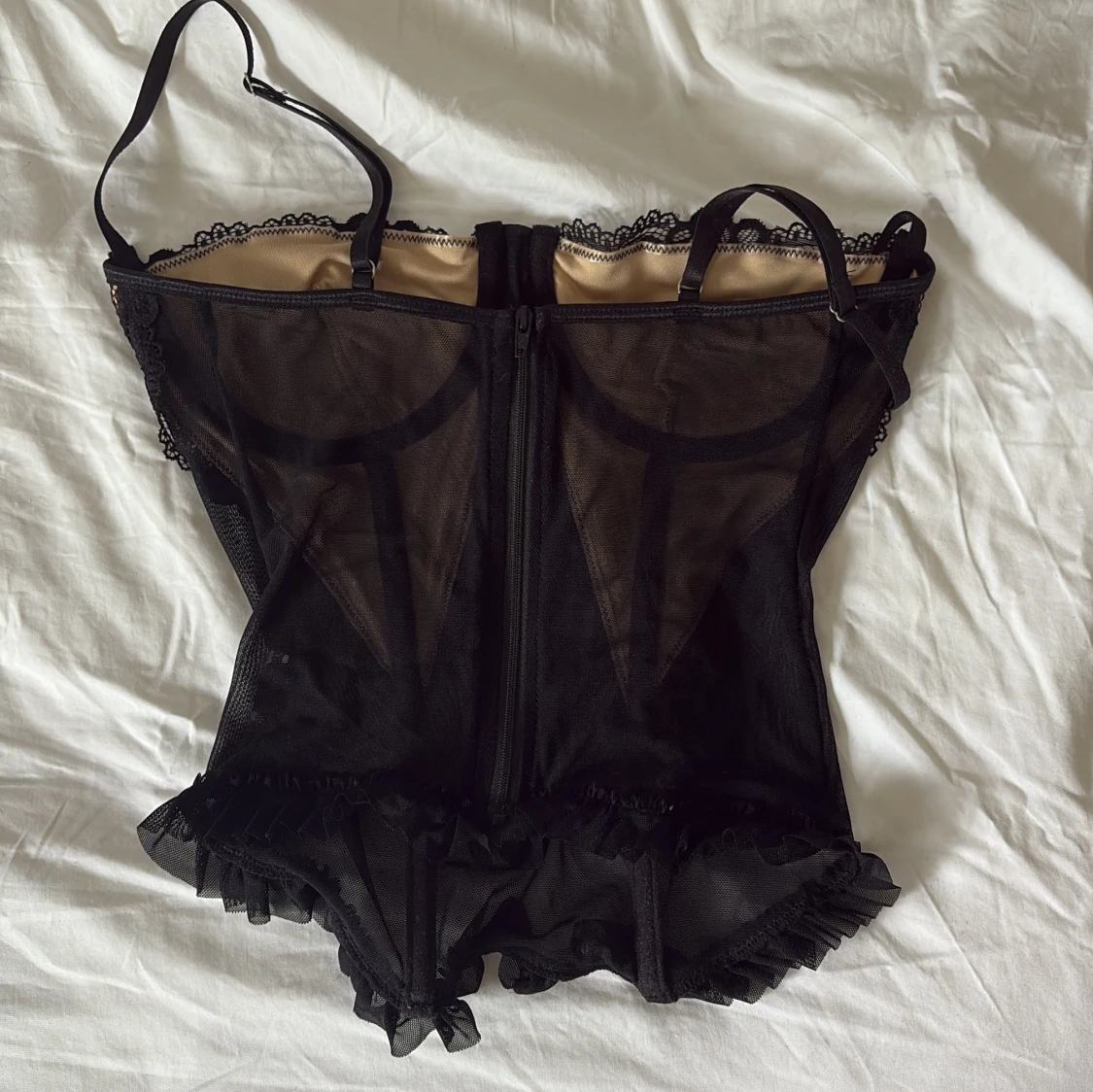 Säljer en svart korsettopp med tunna justerbara axelband och vacker spets framtill. Toppen har meshpartier oxh dragkedja i ryggen. Spetsen har ett blommigt mönster som ger en lyxig känsla. Perfekt för dig som vill sticka ut med en edgy och feminin look. Vet ej var den är ifrån köpte från Vinted